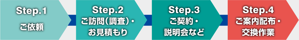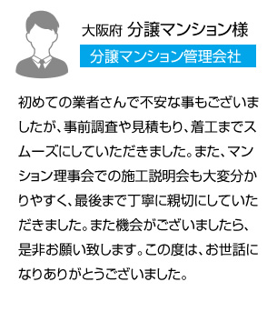 水道子メーター交換にあたり、マンションの理事会・管理組合での説明や、入居者様への取替前後のご案内配布など全て対応させていただきます。取替時の立ち会いも不要で、交換前後のお写真と報告書も提出いたしますので、安心してお任せください。